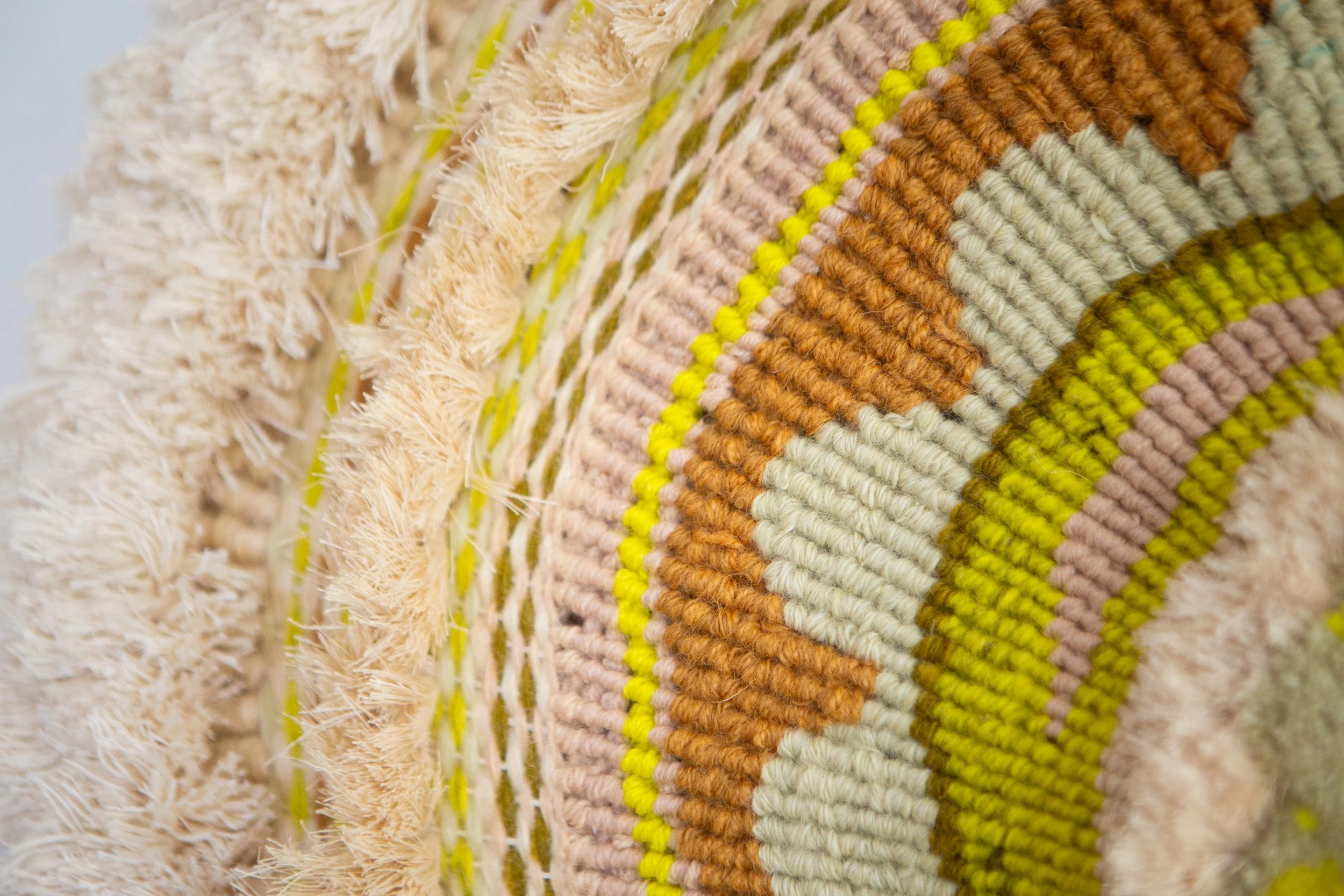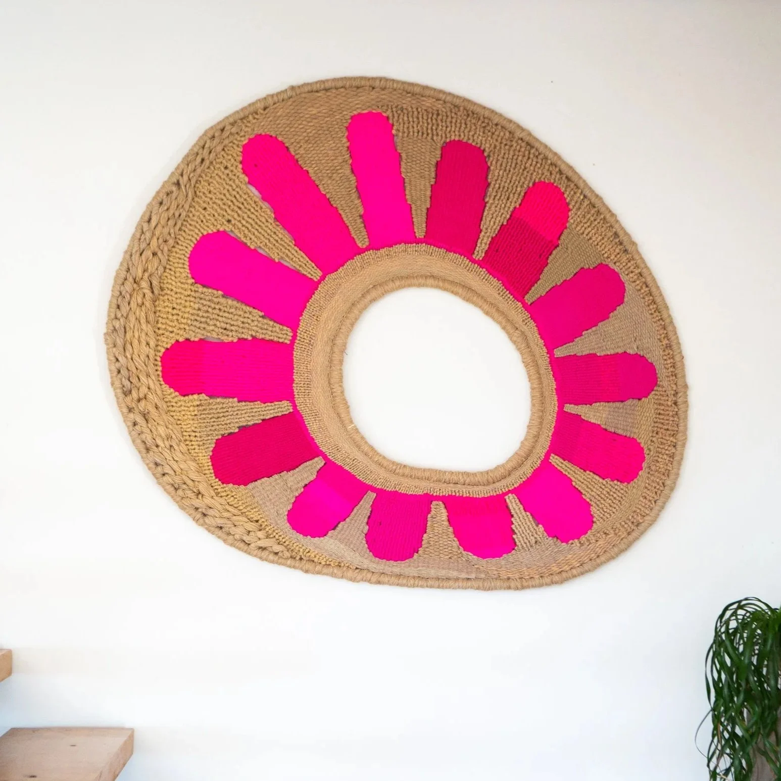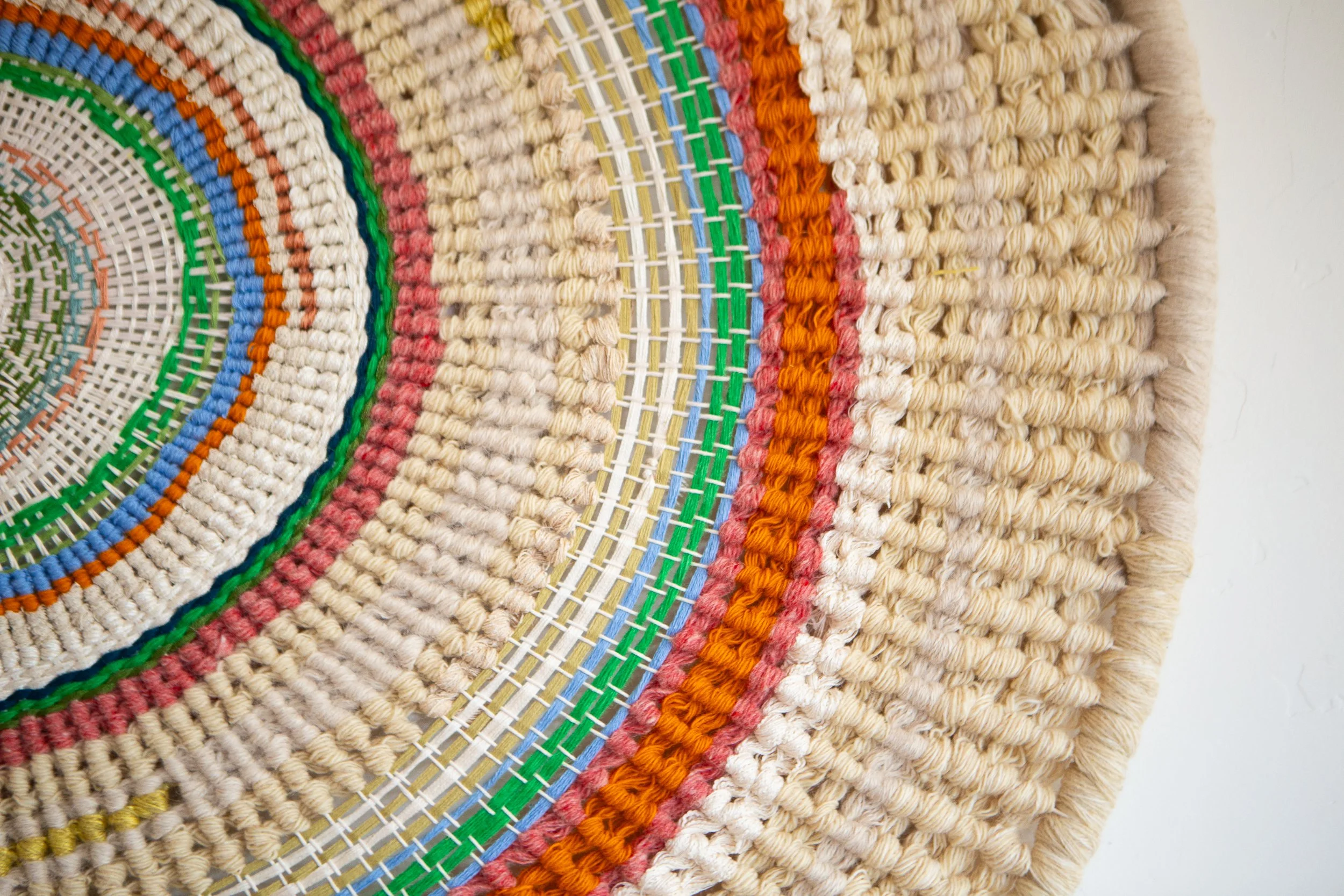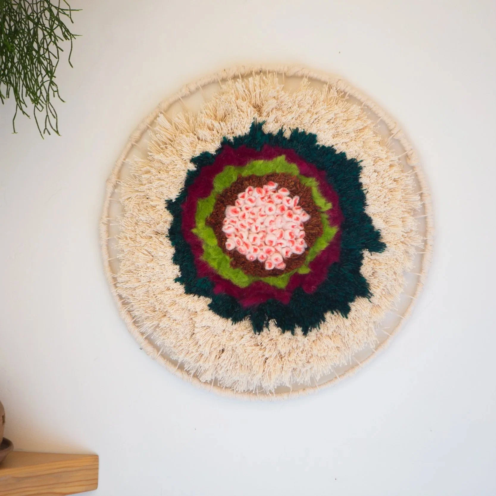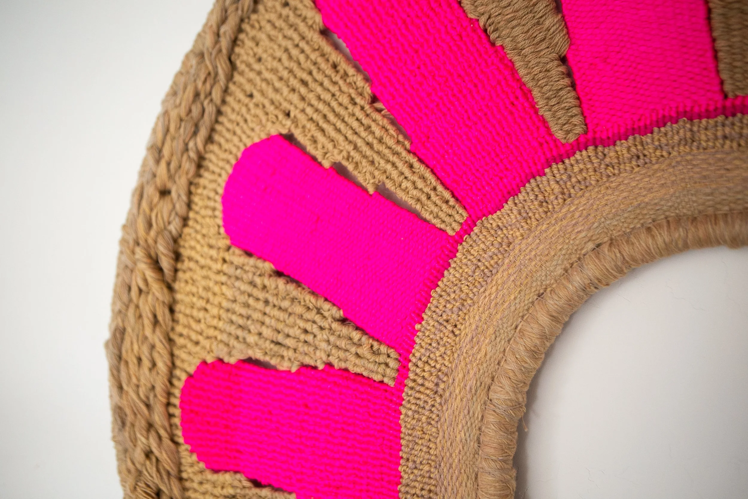Person working on a woven home decor piece with pink accents, using their hands and holding a strand of material.
