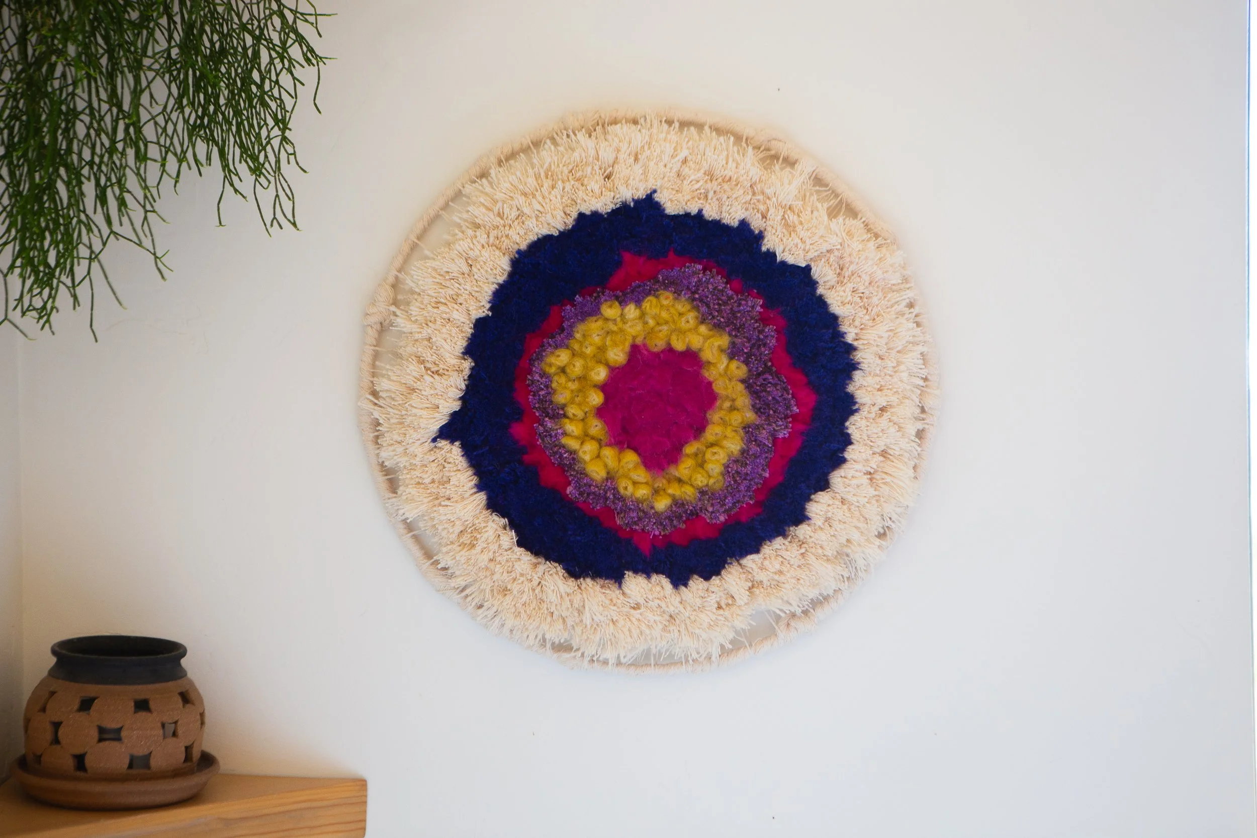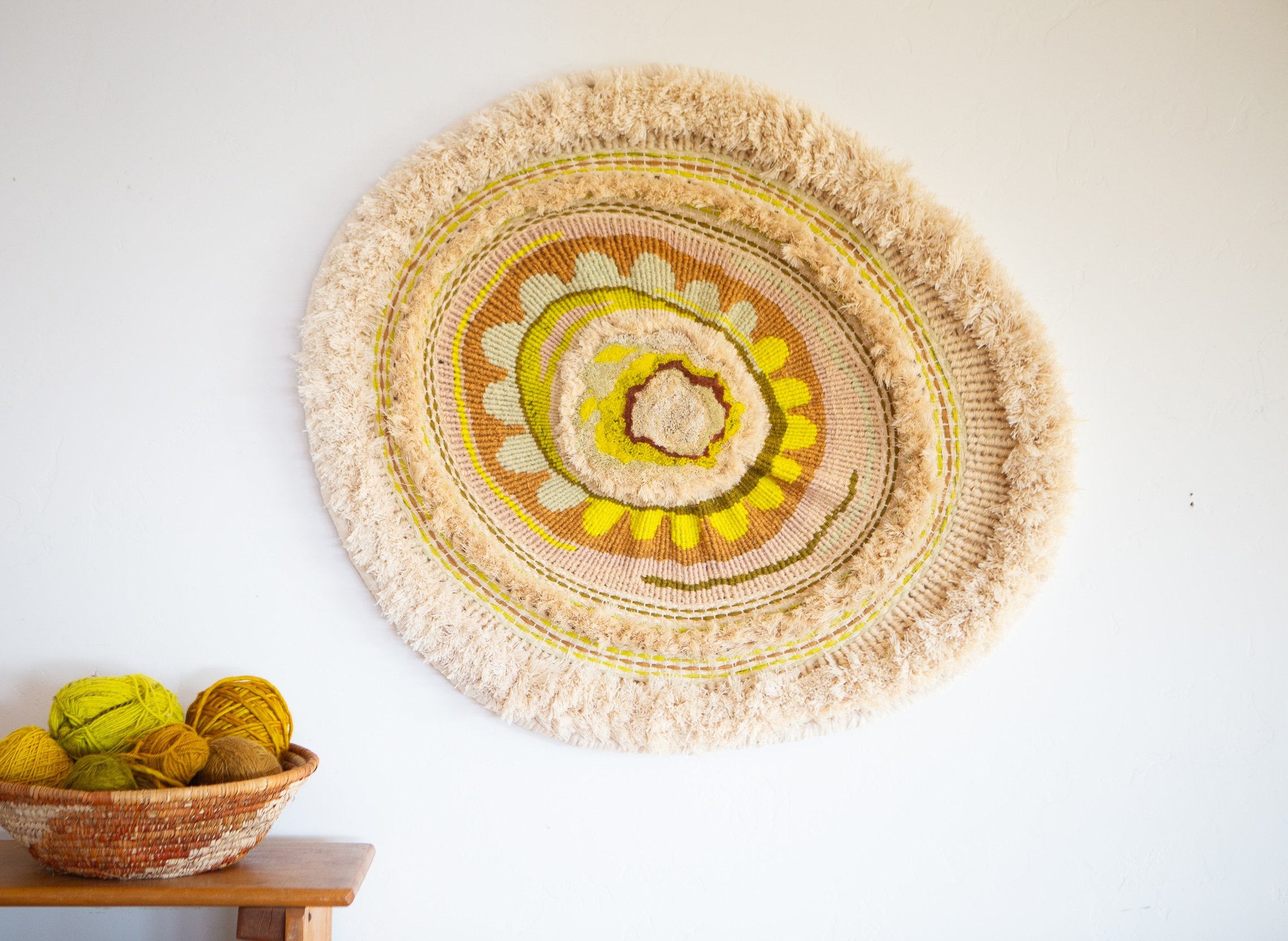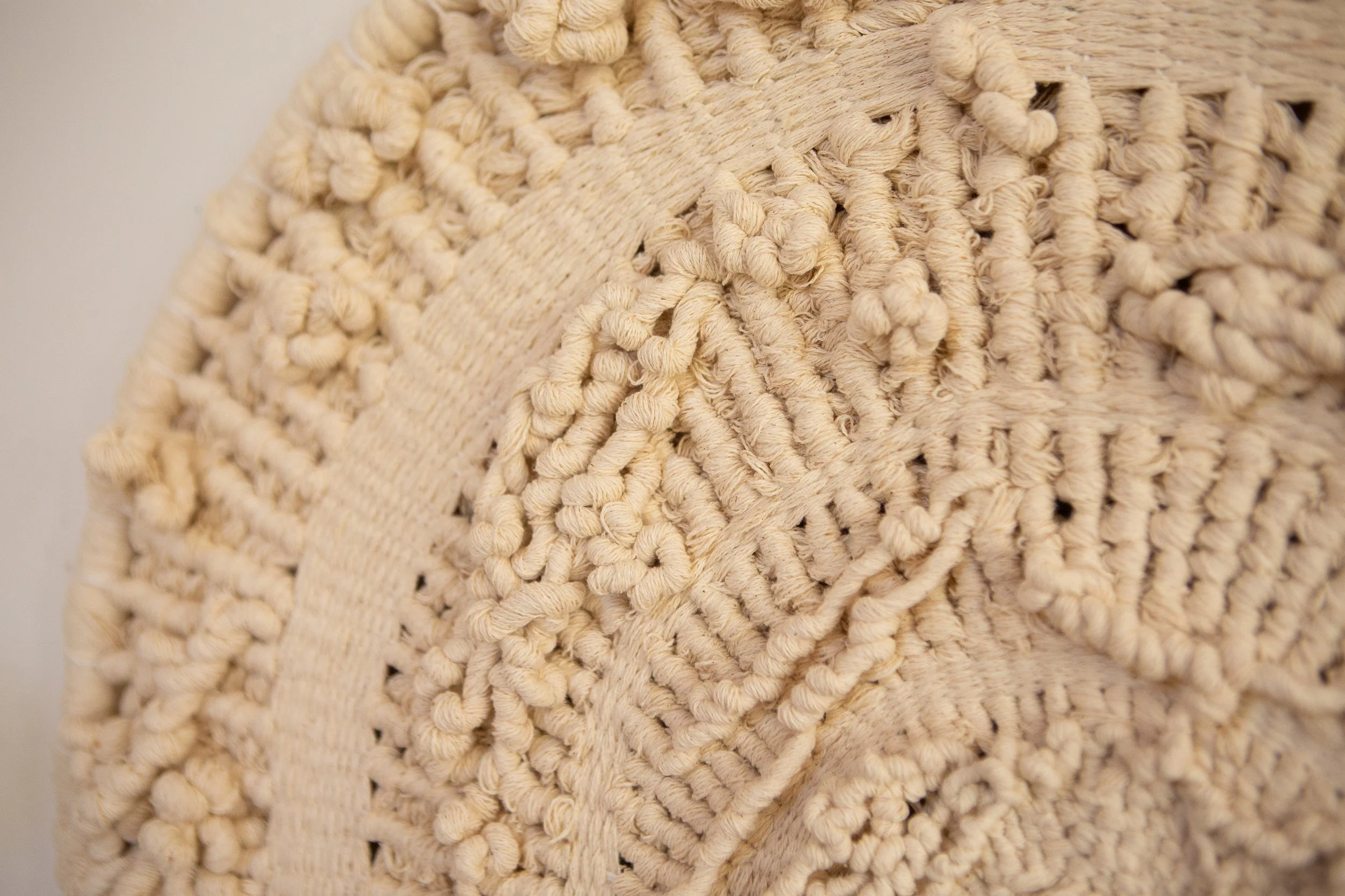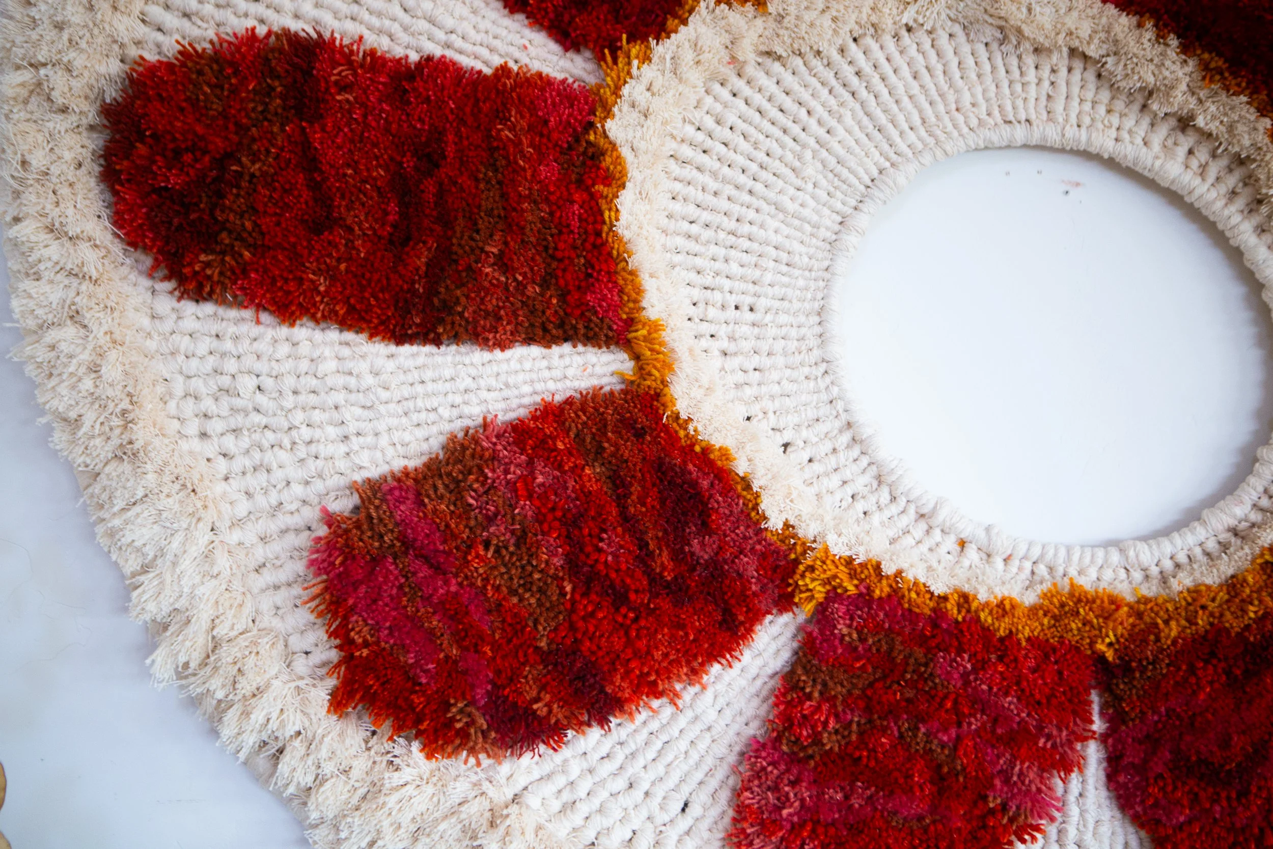 Person working on a woven home decor piece with pink accents, using their hands and holding a strand of material.