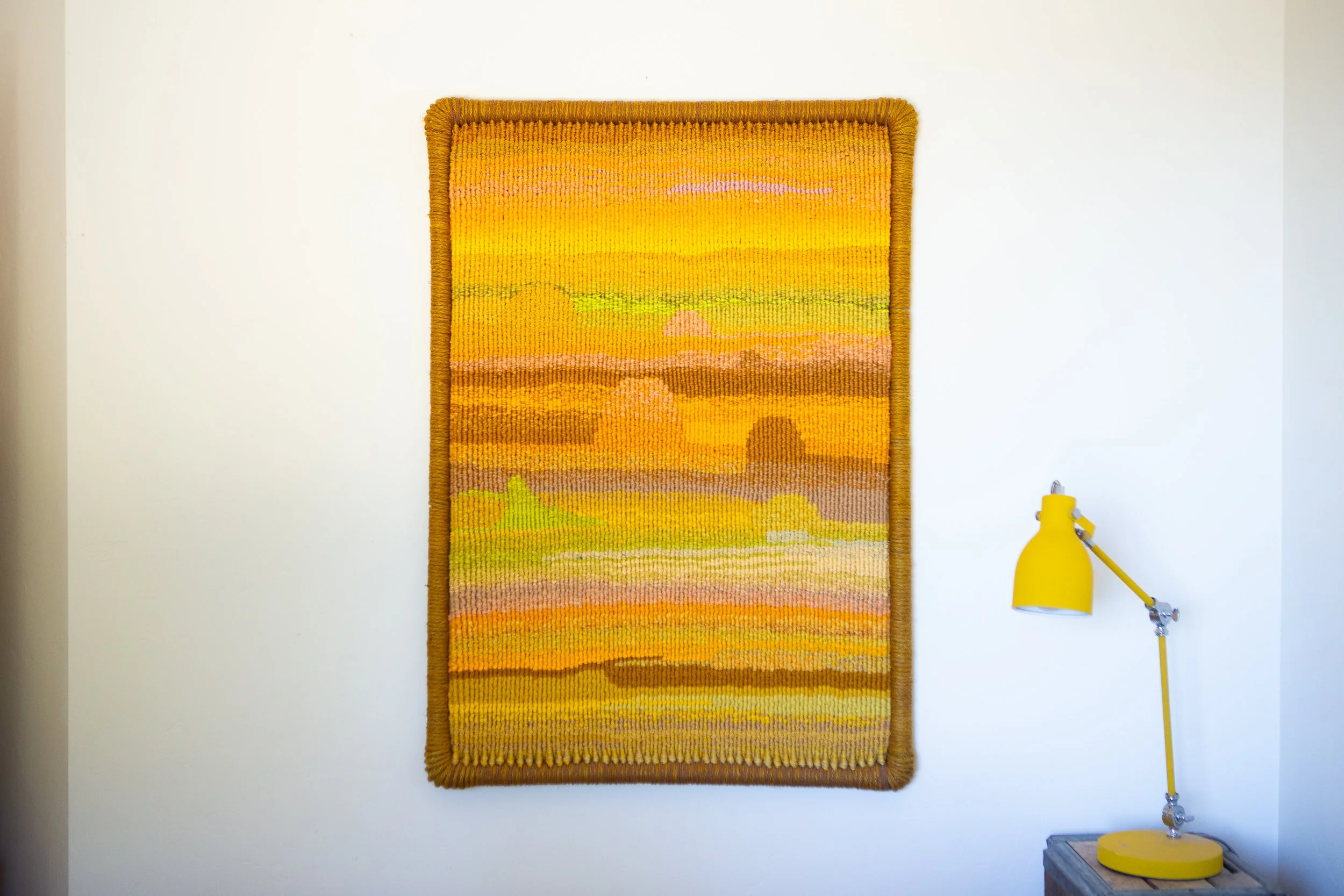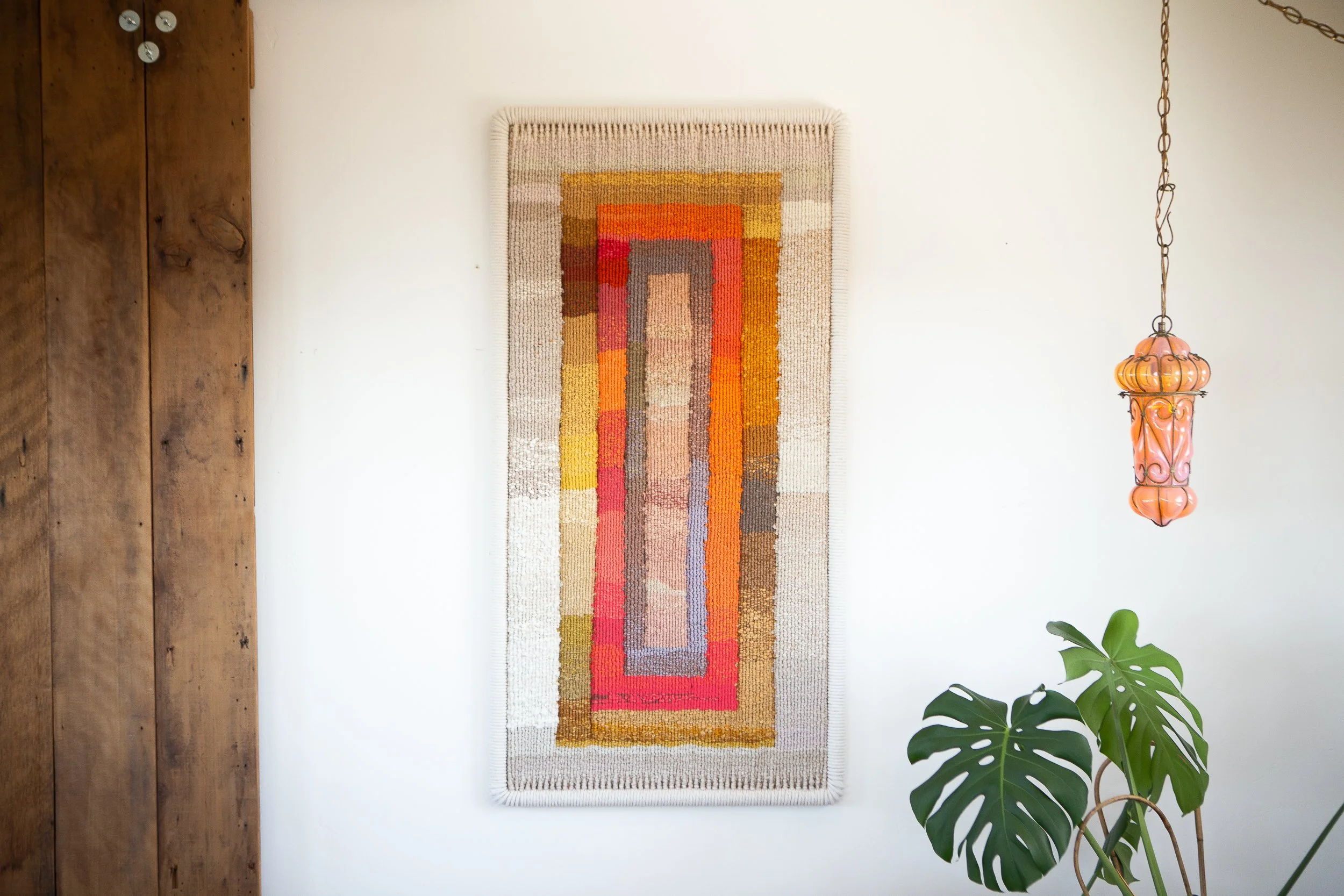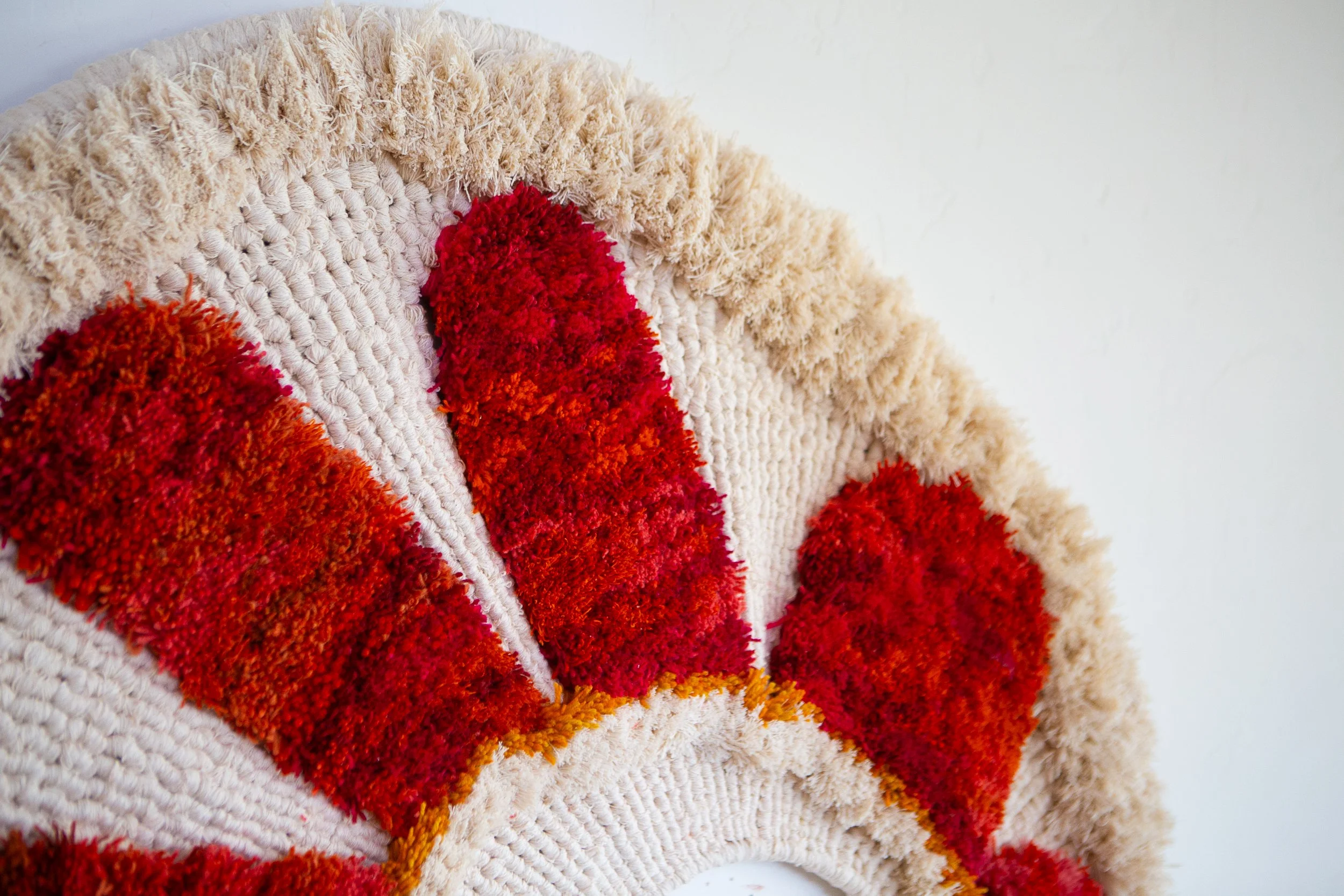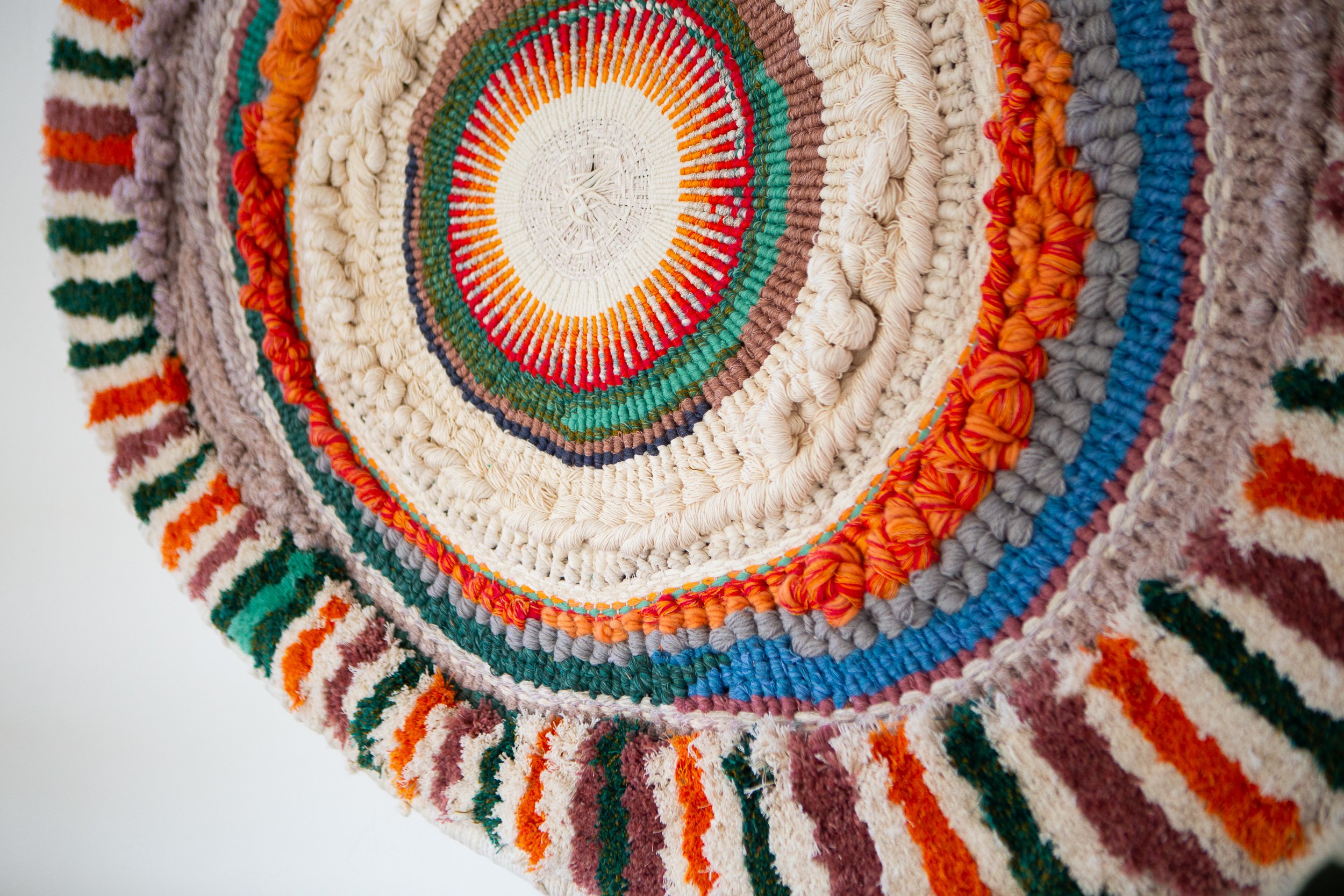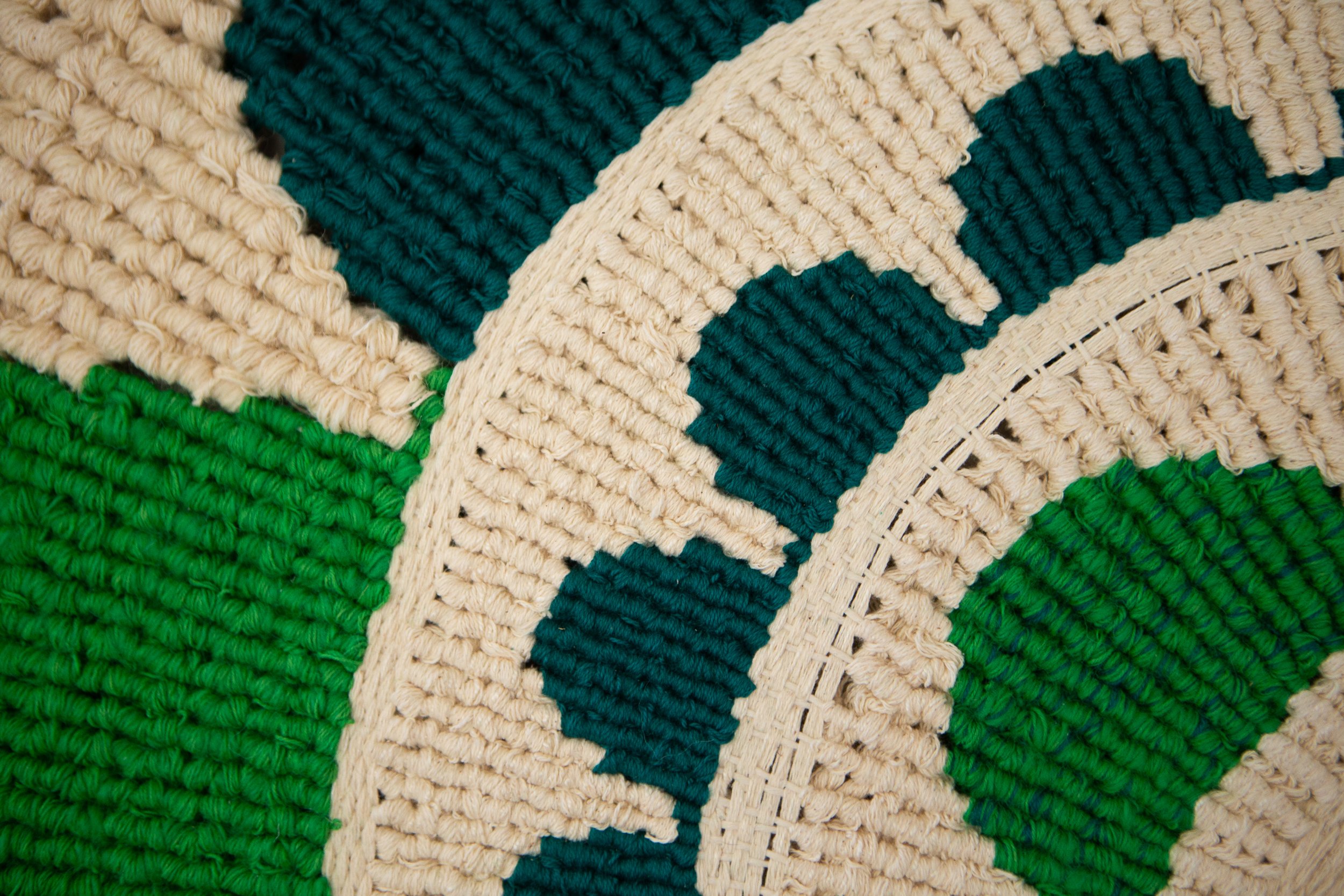 Person working on a woven home decor piece with pink accents, using their hands and holding a strand of material.